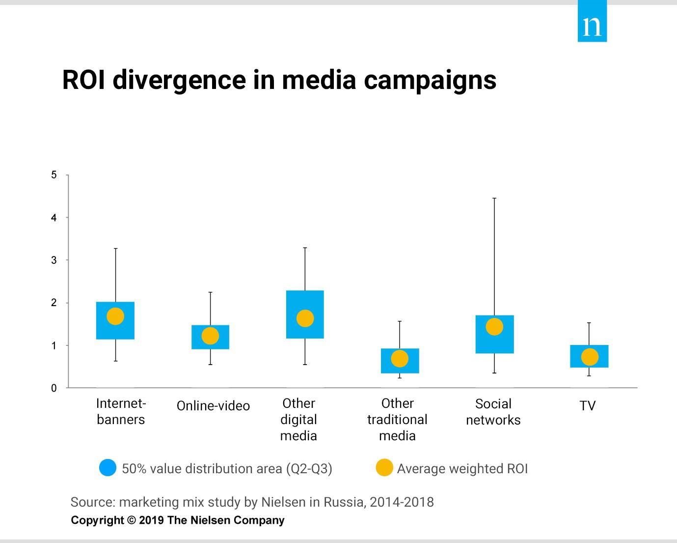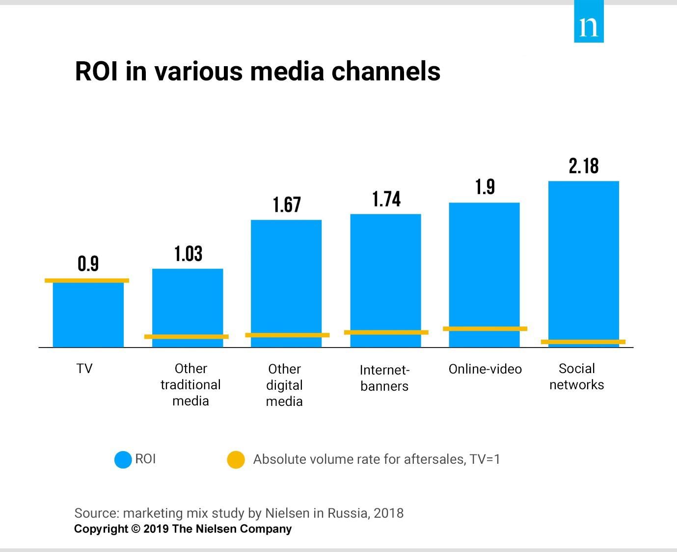 Nielsen conducted a research of return on investments made in advertising campaigns via various media channels using ROI. A similar study in 2018, but involving only Internet channels, was made by Roistat. Here we share data from these studies that will help answer questions stated above.