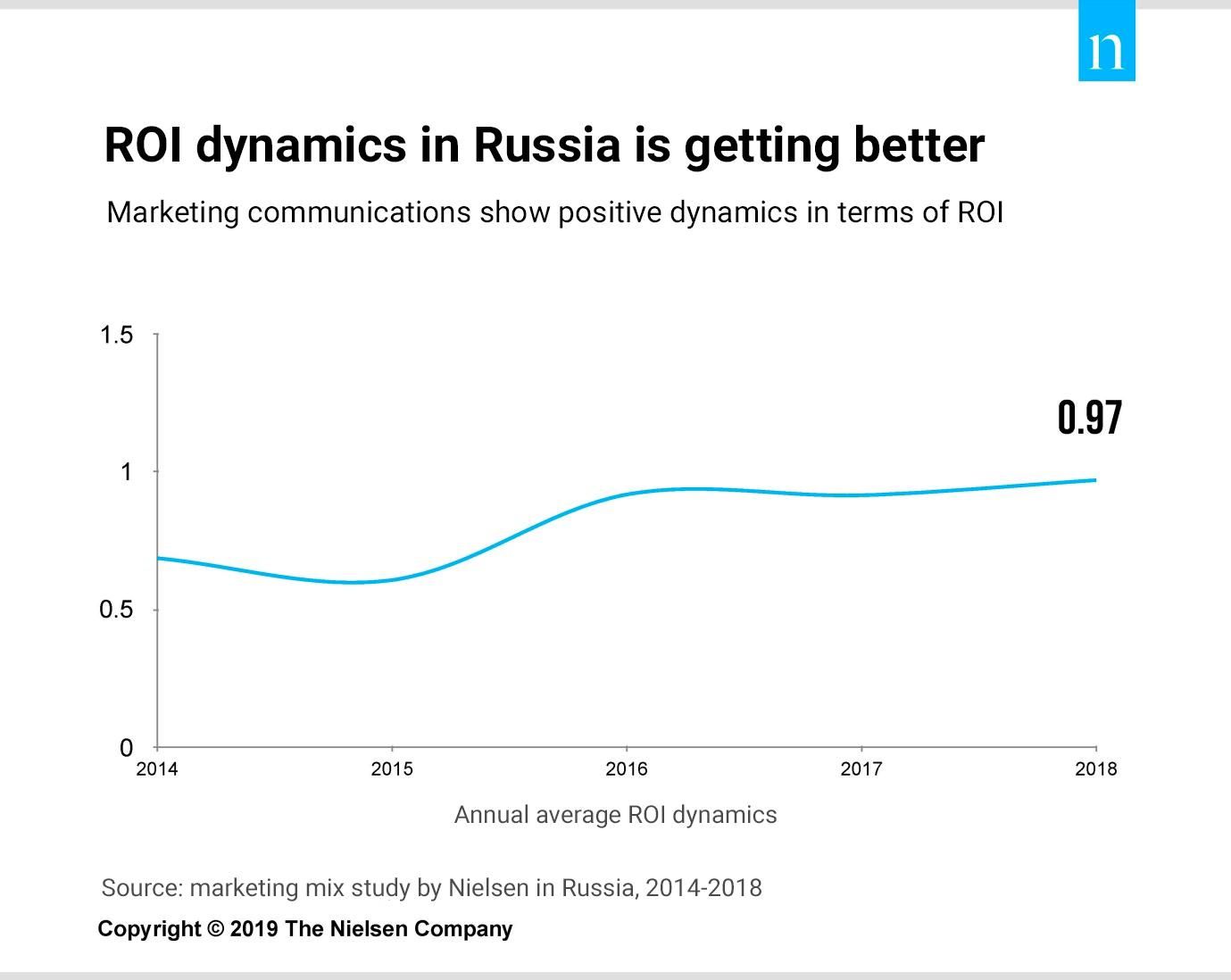 The study by Nielsen demonstrates that media channels affect the customer demand more and more. As compared to 2015 when ROI came down to 0.6, the following years show positive dynamics.