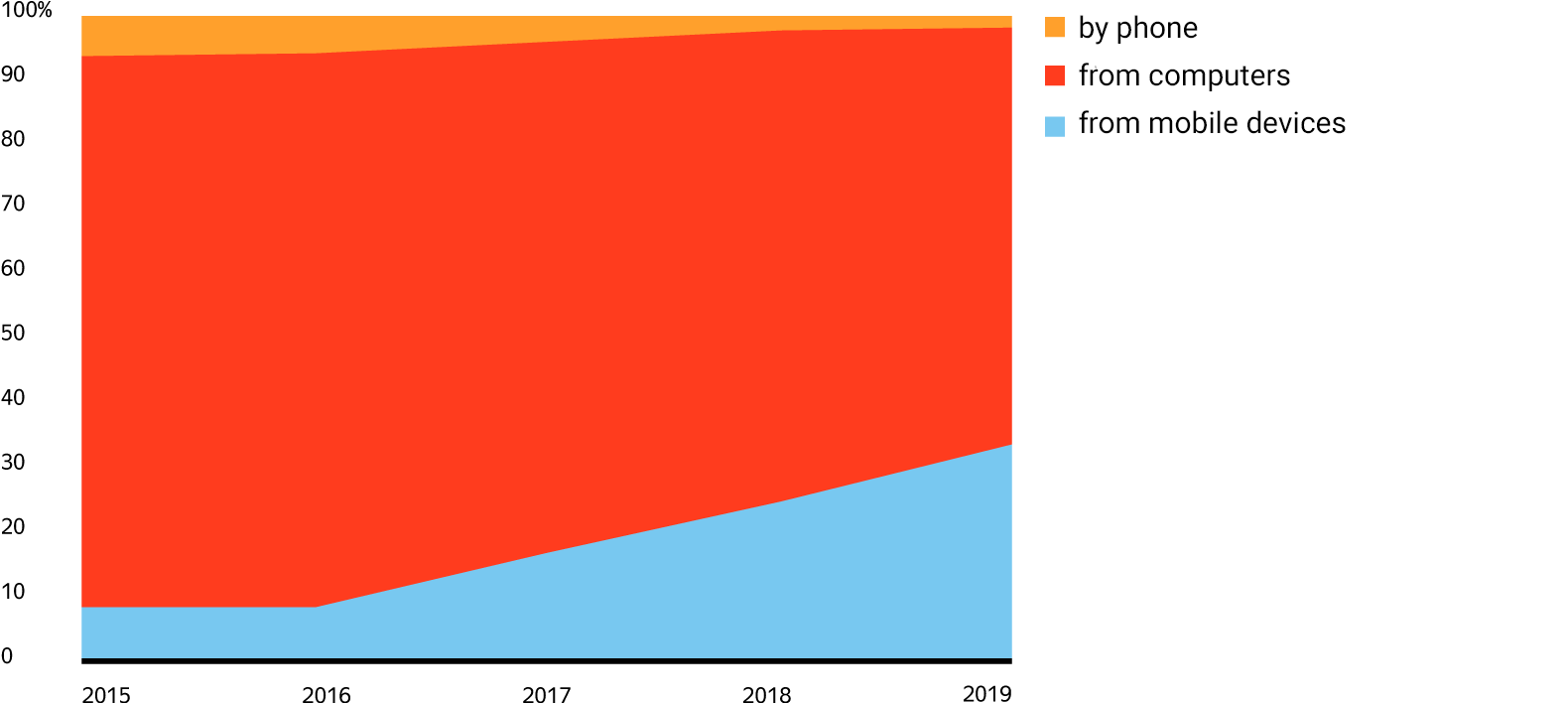 Every third respondent made his or her last online purchase from a smartphone or a tablet. Compared with a year earlier, the share of such orders has grown by half.