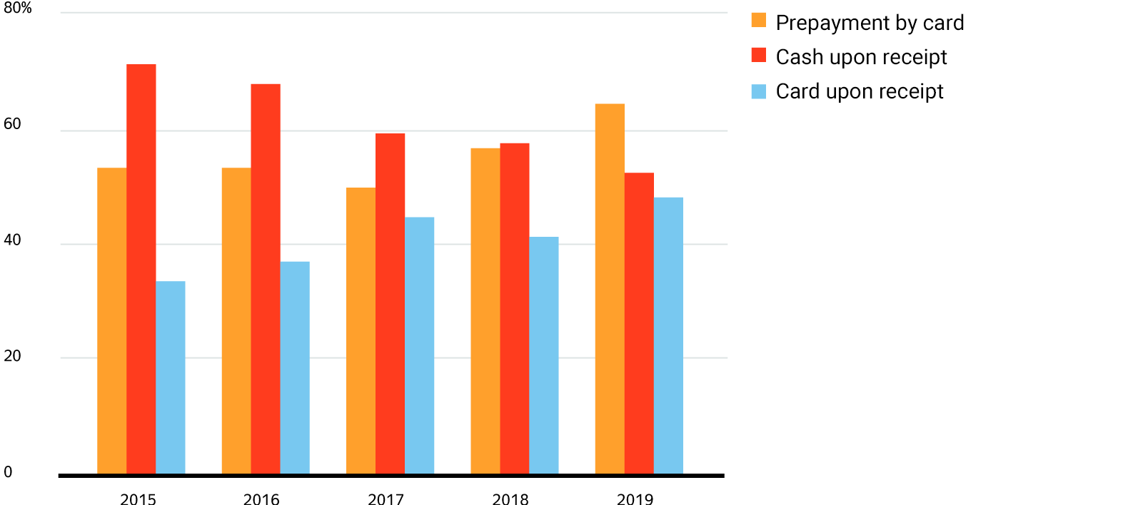The popularity of prepayment by card is growing: while two years ago this method was used by half of the buyers at least once a year, there are almost two-thirds of them already this year. At that, the share of respondents who named this way as the most convenient one grew just a little, from 25% to 27%. Most people consider card payment upon receipt of goods the most preferable payment method, and their share is growing: 36% buyers said so last year and 43% this year. This method was used by 48% of respondents.