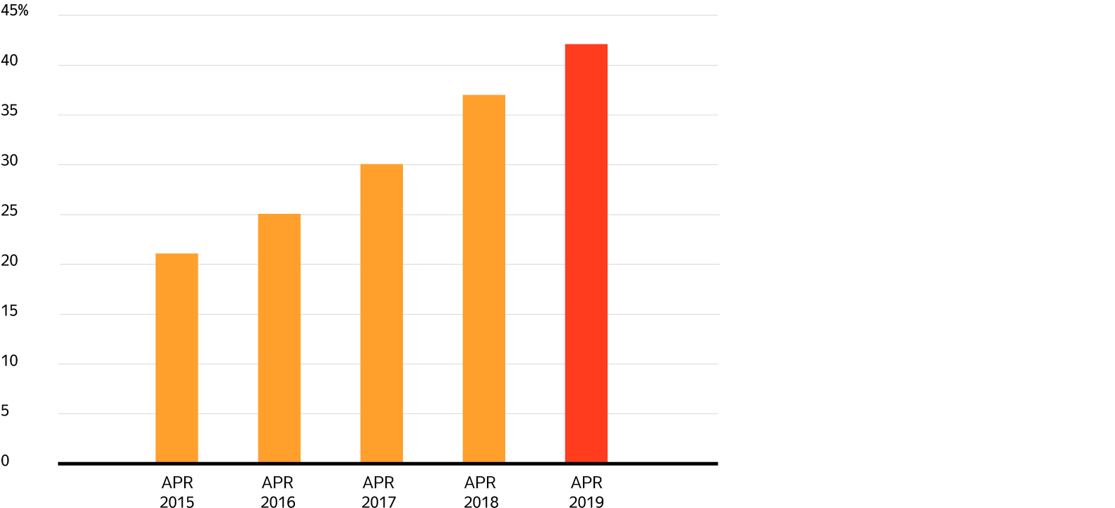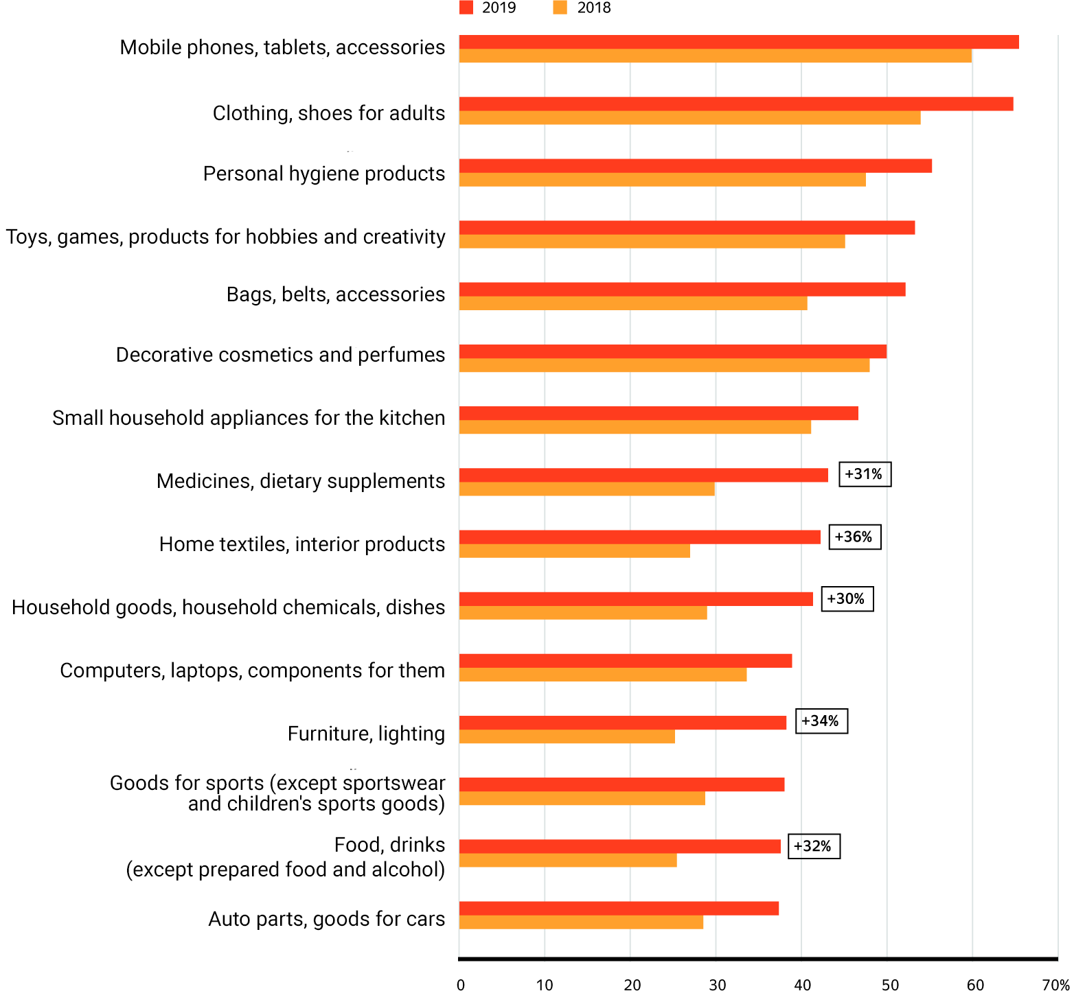 The goods the online demand for which grows best are FMCG: baby care goods, food and drinks, household goods, chemicals, and dishes. In 2019, these goods were ordered by 30% more respondents. The slowest demand increase is for color cosmetics and perfumes (+4%), as well as on mobile devices (+9%).